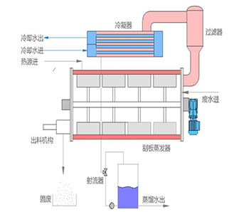 ①蒸發結晶器啟動,利用真空泵抽取真空形成筒內負壓,廢水進入蒸發結晶器;