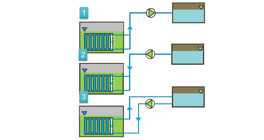 膜組件直接放置在曝氣池中,通過負壓泵將凈化后的水抽出,活性污泥則被截留在曝氣池內。膜組件下方還會設置曝氣裝置,通過氣泡使膜片抖動,來減少活性污泥在膜表面的積累,減少膜污染的形成。