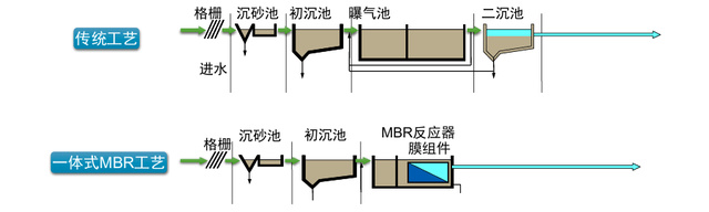 下圖是傳統活性污泥工藝與MBR工藝的對比: