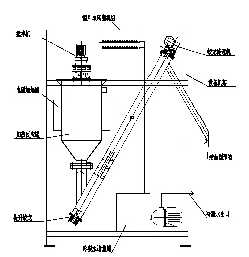 結晶蒸發器主要由進料氣動泵、加熱單元、蒸發反應罐、彈簧刮刀攪拌器、抽風機、冷卻翅片風扇、蛟龍出料裝置、監測控制儀表組成,終實現全自動運行的結晶蒸發器。